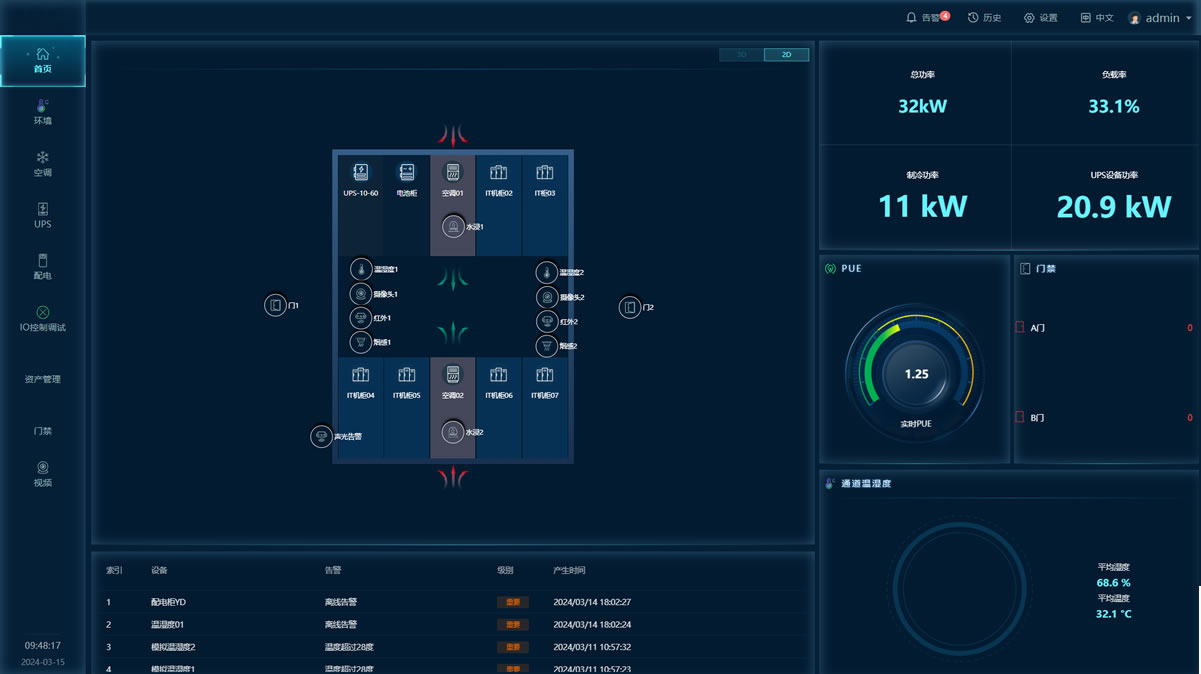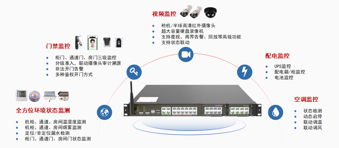 系統(tǒng)架構(gòu)動環(huán)系統(tǒng)主要由智慧監(jiān)控主機、傳感器/控制器、本地控制面板和外部聯(lián)動設(shè)備(接口)等組件組成,并與運行管理系統(tǒng)軟件共同協(xié)作,實現(xiàn)環(huán)境監(jiān)控(煙感、溫濕度、漏水、視頻、門禁)、動力監(jiān)控(配電柜、UPS、電池、空調(diào)),管理監(jiān)控(資產(chǎn)管理、容量管理、能效管理、3D可視化)等功能。